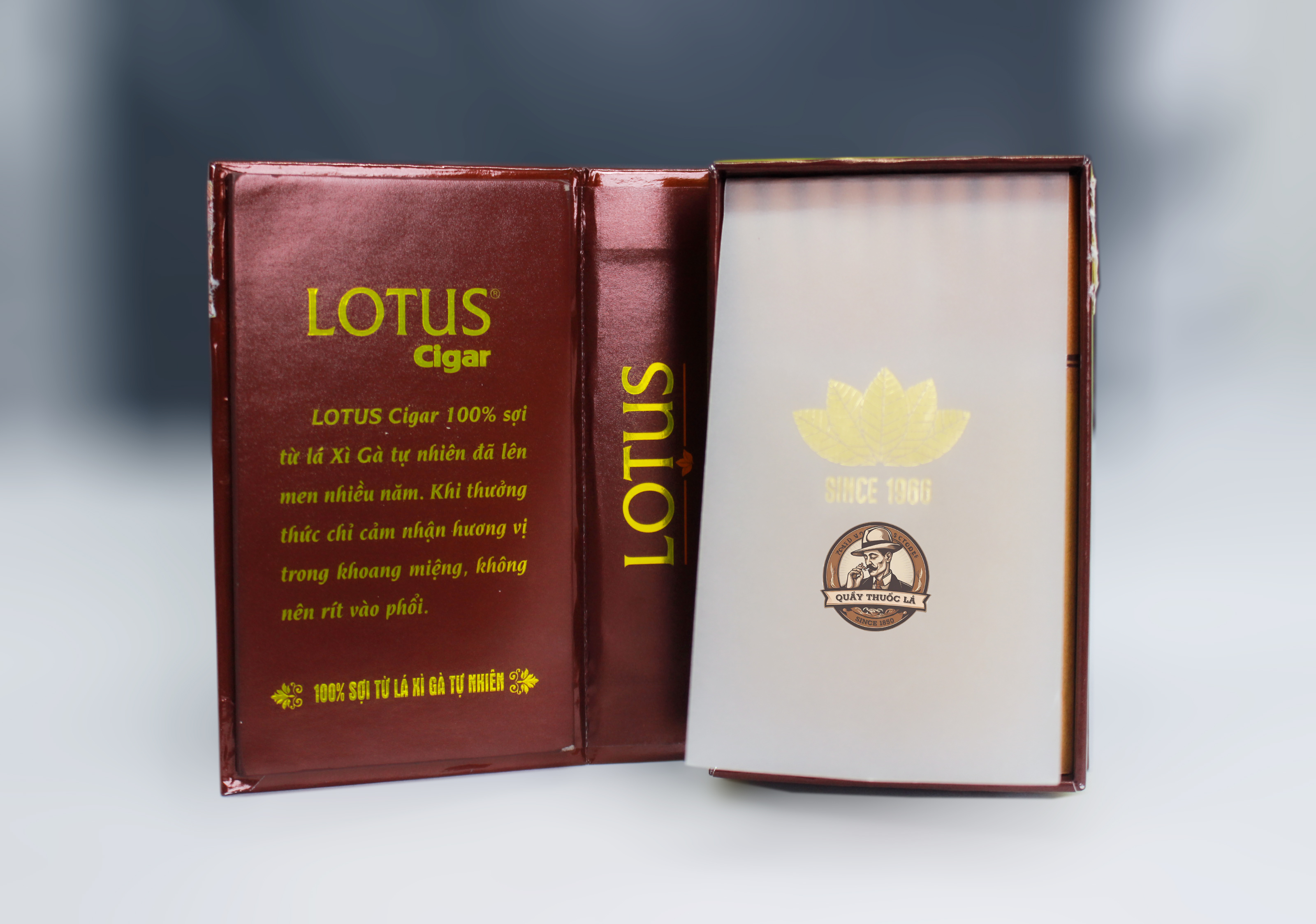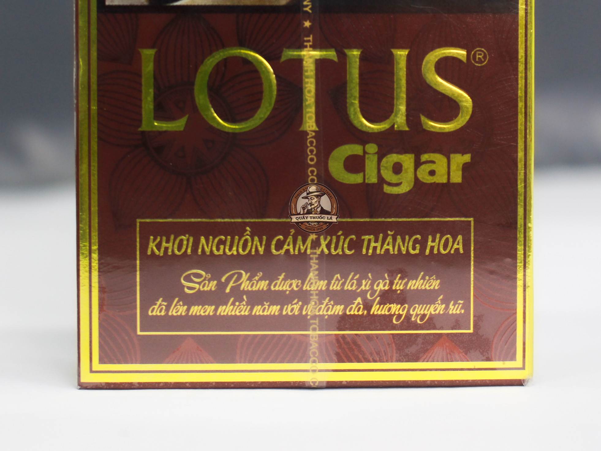 Cigar Lotus được đóng gói trong hộp giấy cứng cáp, tông màu nâu đỏ kết hợp vàng ánh kim nổi bật, tạo cảm giác sang trọng và đẳng cấp. Mặt trước hộp được in logo LOTUS màu vàng, kèm biểu tượng hoa sen mang ý nghĩa thanh khiết và truyền thống lâu đời của người Việt.
