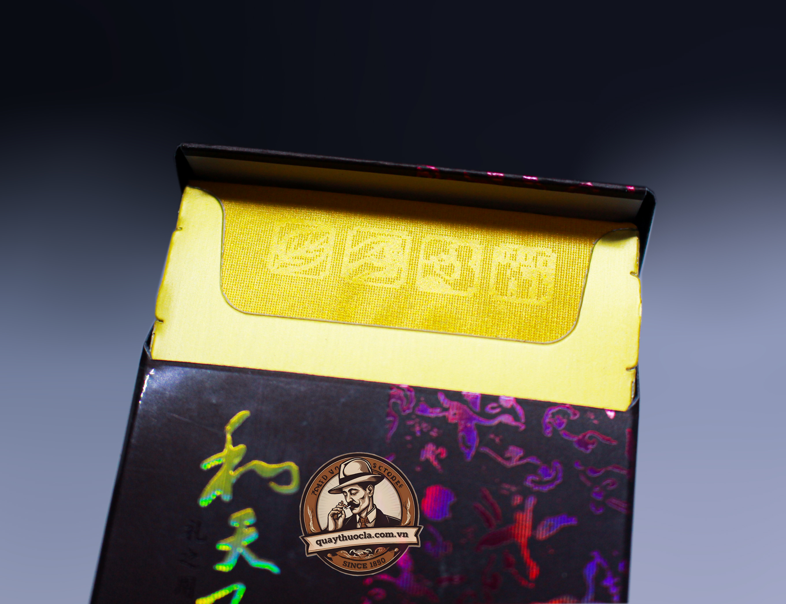 Màu sắc: Bao bì sử dụng tông nâu đậm hoặc tím than trầm mặc, kết hợp với các hoa văn tinh xảo màu vàng gold và đỏ đô lấp lánh, tạo cảm giác quyền lực và bí ẩn.